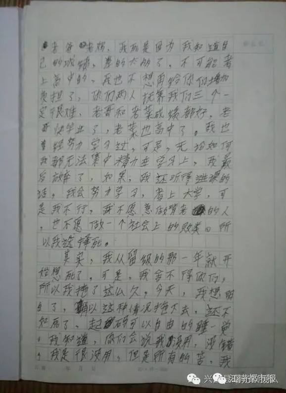老爸老妈,我死是因为我知道自己的成绩差的太多了,不可能考上高中的,我也不想再给你们增加负担了。你们两人抚养我们三个一定很难,老哥和老菜成绩都好,老哥快毕业了,老菜也高中了,我也曾经努力学习过,可是,无论如何我都无法集中精力在学习上,我最后放弃了,如果我还听得进课的话,我会努力学习,考上大学的,可是我不行,我不愿意做啃老的人,也不愿做一个社会上的败类,所以我选择死。