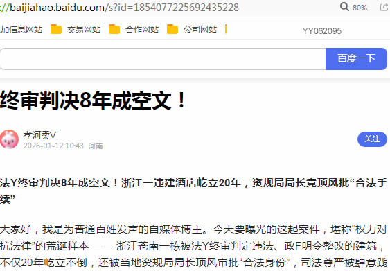 大家好,我是为普通百姓发声的自媒体博主。今天要曝光的这起案件,堪称“权力对抗法律”的荒诞样本 —— 浙江苍南一栋被法Y终审判定违法、政F明令整改的建筑,不仅20年屹立不倒,还被当地资规局局长顶风审批“合法身份”,司法尊严被肆意践踏,这背后的“保护伞”该彻底清查了!
