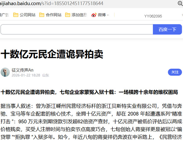 据当事人叙述:曾为浙江嵊州民营经济标杆的浙江贝斯特实业有限公司,凭借与奔驰、宝马等车企配套的核心技术,坐拥十亿元资产,却在 2008 年起遭遇系列“精准打击 ”:950 万元未到期贷款引发超62倍资产查封,十亿元资产被低价评估后以两成价格贱卖,买受人注册时间与拍卖节点高度巧合,七旬创始人蒋斐祥更是被冠以“骗贷罪 ”“拒执罪 ”入狱多年。如今,年近八旬的蒋斐祥仍奔波在申诉路上,《民营经济促进法》的施行让他重燃希望,而这场横跨十余年的案件背后,司法程序的诸多疑点与民营企业家合法权益的保护问题,亟待答案。