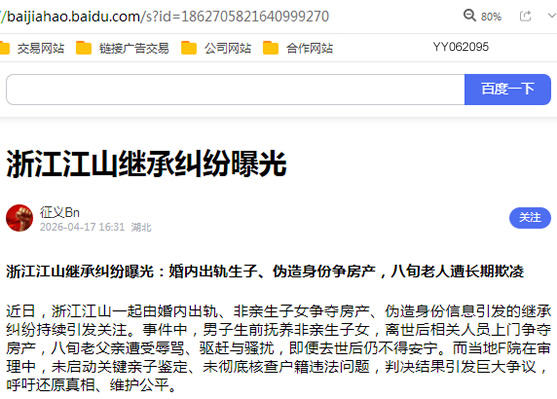 浙江江山继承纠纷曝光:婚内出轨生子、伪造身份争房产,八旬老人遭长期欺凌